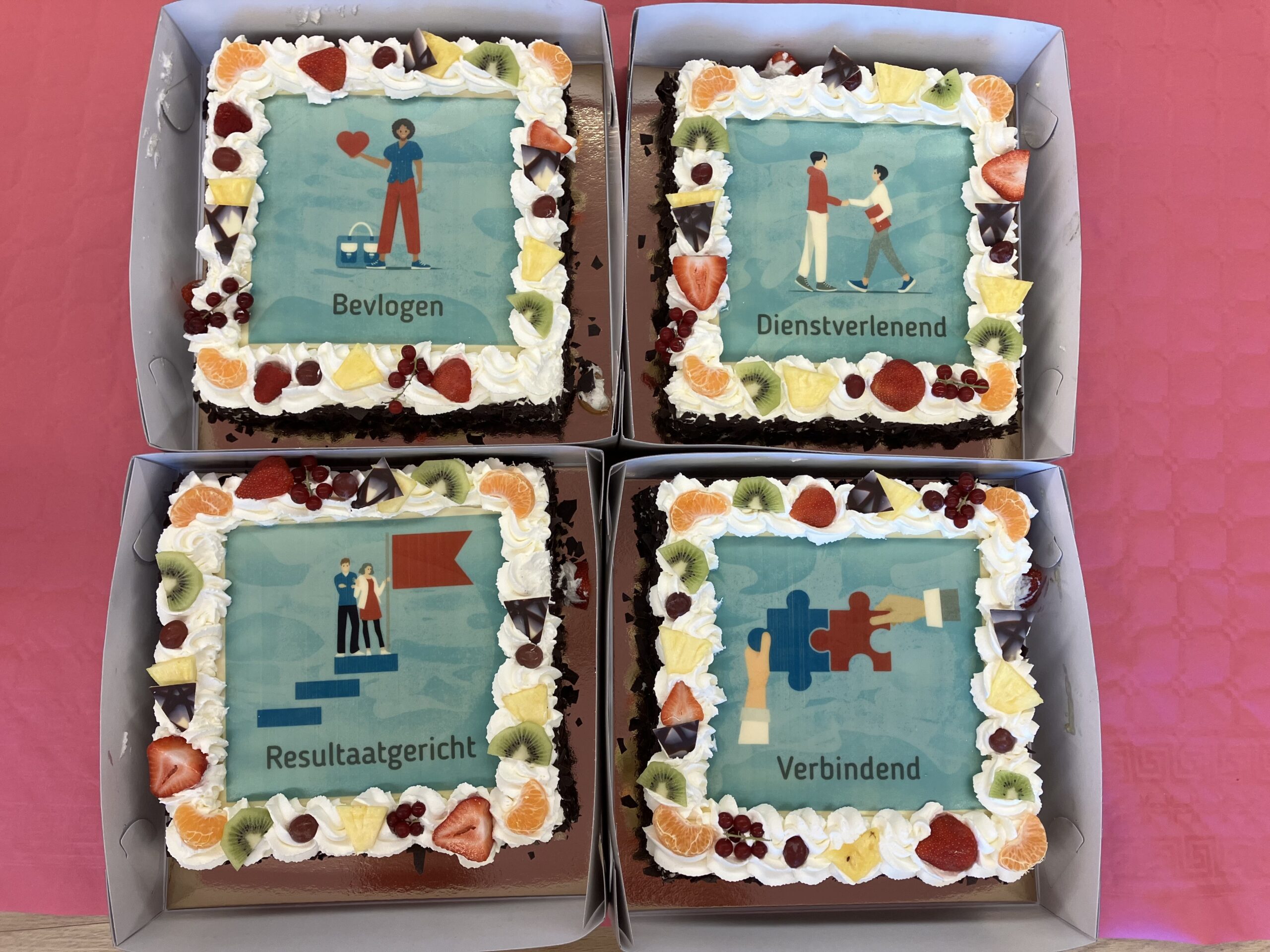 Met vier kernwaarden-taarten hebben we vandaag tijdens een feestelijke bijeenkomst onze vier nieuwe kernwaarden gelanceerd: Bevlogen, Resultaatgericht, Dienstverlenend en Verbindend. Deze kernwaarden bieden houvast en geven richting aan ons werk, vertelt Mark Hoogenberg, manager Wmo.