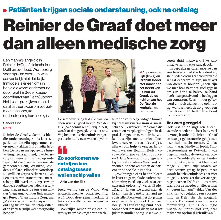 Mooi artikel in Algemeen Dagblad, waarin collega Ibrahim Beder vertelt over onze samenwerking met Reinier de Graaf ziekenhuis. Wij bieden samen met het Sociaal Kernteam Westland ondersteuning aan ziekenhuispatiënten met sociaal-maatschappelijke problemen. Denk aan niet-passende huisvesting, eenzaamheid, overbelasting of financiën die niet op orde zijn. Zo voorkomen we met elkaar dat zij na hun ontslag tussen wal en schip belanden of op korte termijn weer zorg nodig hebben.